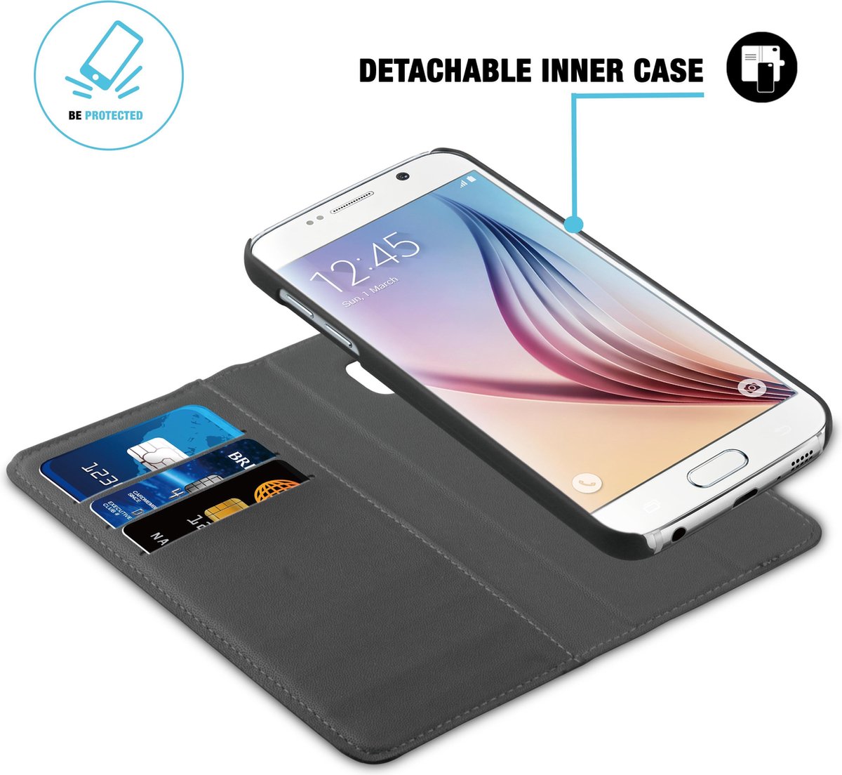 De BeHello 2-in-1 Wallet Case Black beschermt je toestel tegen onder andere krassen en stoten. Met deze case heb je zelfs de mogelijkheid om te kiezen op welke manier je de case wilt gebruiken. Door de 2-in-1 functie kan je de binnenhoes los halen en vervolgens gebruiken als hoesje Back Case. Deze zitten aan elkaar verbonden door middel van magneetjes. In de Wallet Case kunnen er ook pasjes en briefgeld worden gestopt, dus een losse portemonnee meenemen is met deze case verleden tijd. De aangebrachte uitsparingen zorgen ervoor dat alle poorten, knoppen en camera de beschikbaar blijven.