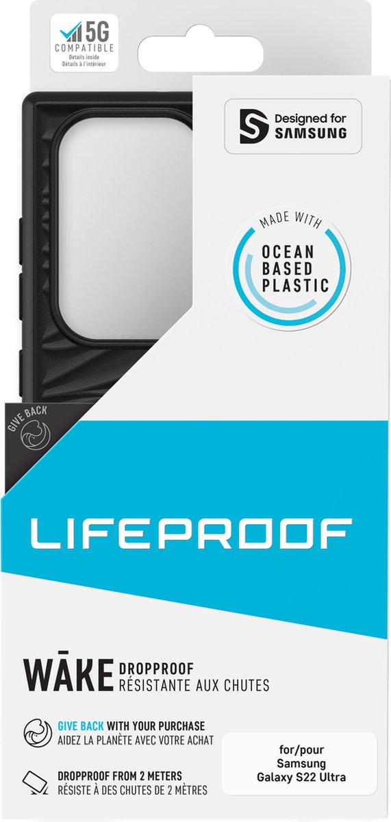 De LifeProof Wake is een duurzaam hoesje dat voor 85% bestaat uit gerecycled plastic uit de oceaan, zoals oude visnetten. Dankzij valbescherming tot 2 meter hoogte is je Samsung Galaxy S22 Ultra beschermd tegen vallen tot deze hoogte. Door de verstevigde randen met verhogingen is het display beschermd tegen krassen en slijtage wanneer je jouw telefoon vlak neerlegt.