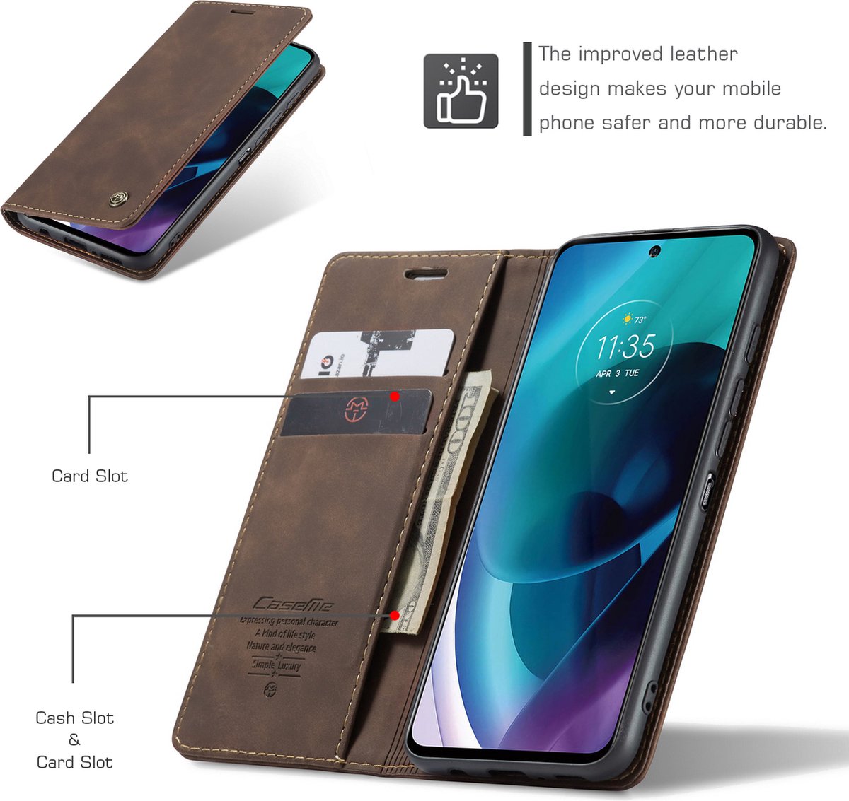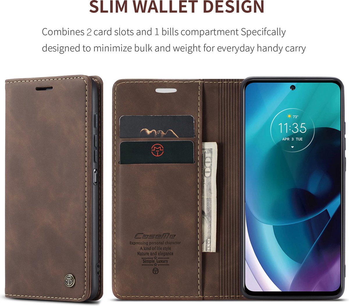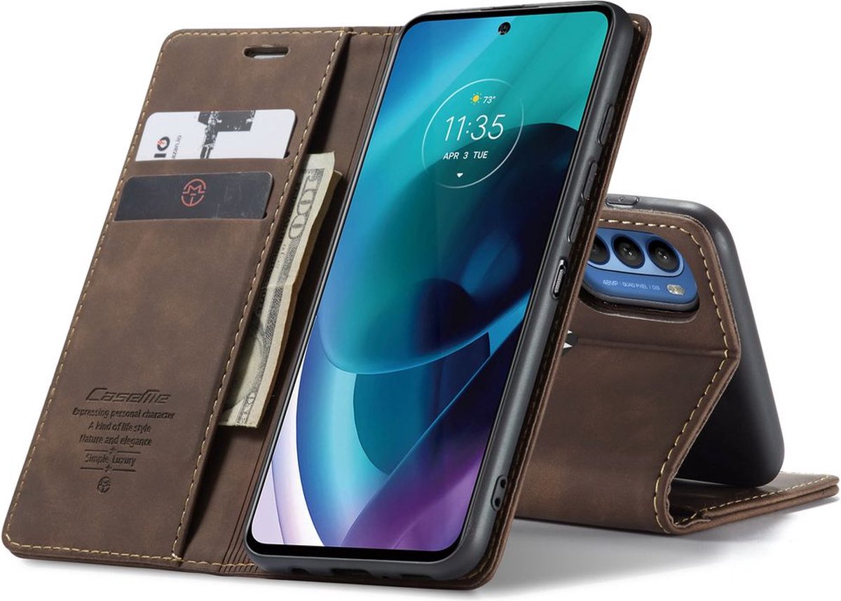 De CASEME Retro Wallet Case is een elegant telefoonhoesje welke op maat is gemaakt voor de Motorola Moto G71. Het Motorola Moto G71 hoesje is vervaardigd uit PU-leder en beschikt over twee vakjes voor pasjes en een sleuf om briefgeld in te stoppen. Daarnaast maakt de Retro Wallet Case gebruik van een magnetische sluiting en kan het hoesje gebruikt worden als standaard om de Motorola Moto G71 in een comfortabele kijkhoek te plaatsen. De CASEME Motorola Moto G71 Retro Wallet Case bevat uitsparingen voor alle poorten en knoppen, waardoor alle functies van de Motorola Moto G71 toegankelijk blijven.