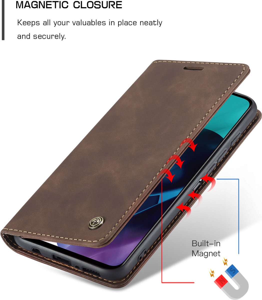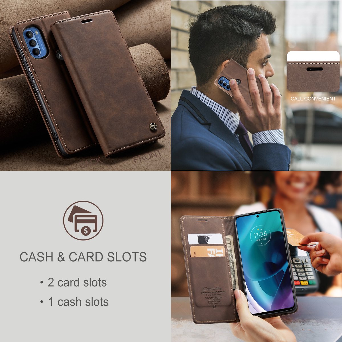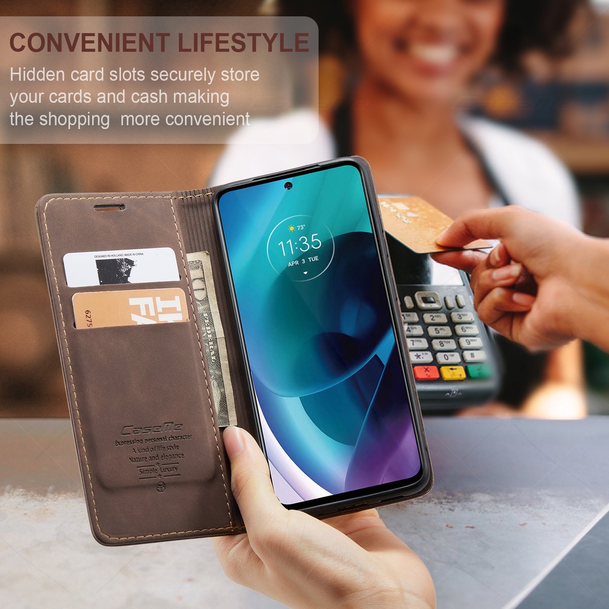 De CASEME Retro Wallet Case is een elegant telefoonhoesje welke op maat is gemaakt voor de Motorola Moto G71. Het Motorola Moto G71 hoesje is vervaardigd uit PU-leder en beschikt over twee vakjes voor pasjes en een sleuf om briefgeld in te stoppen. Daarnaast maakt de Retro Wallet Case gebruik van een magnetische sluiting en kan het hoesje gebruikt worden als standaard om de Motorola Moto G71 in een comfortabele kijkhoek te plaatsen. De CASEME Motorola Moto G71 Retro Wallet Case bevat uitsparingen voor alle poorten en knoppen, waardoor alle functies van de Motorola Moto G71 toegankelijk blijven.
