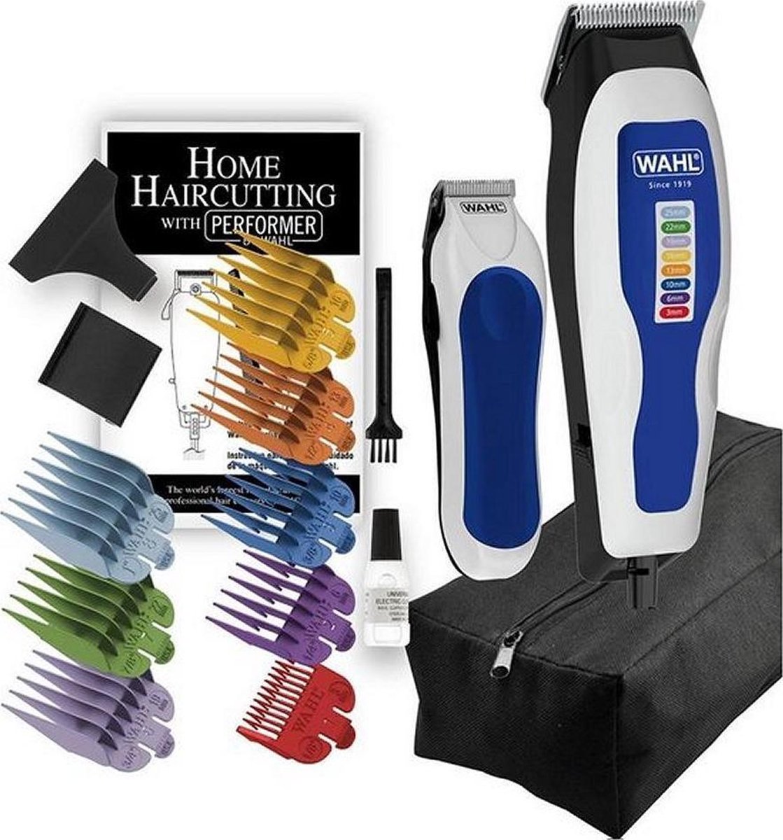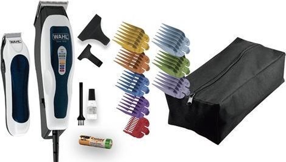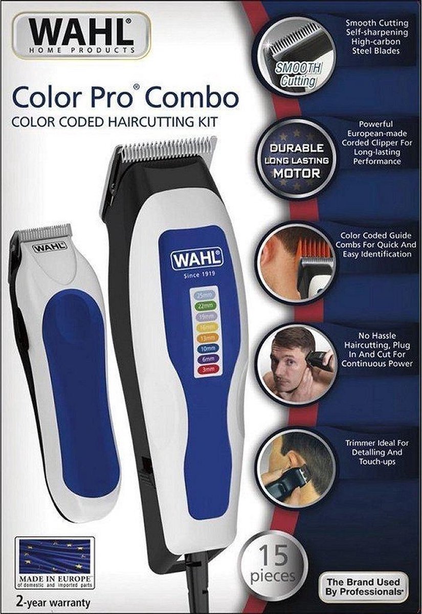Neem contact met ons opDe Color Pro Combo-tondeuse en trimmer van Wahl zijn een combinatieset die bestaat uit een tondeuse en een batterij-aangedreven mini-trimmer (1 x AA-batterij vereist, niet inbegrepen). De compacte mini-trimmer is ideaal voor details en touch-ups! Beide apparaten hebben krachtige en duurzame trillingsmotoren die geschikt zijn voor langdurig gebruik. Deze tondeuse levert een professionele snijprestatie met gelijkmatige resultaten dankzij de precisie-, zelfslijpende, koolstofstalen mesjes die langer scherp blijven dan andere mesjes die verkrijgbaar zijn op de huidige markt. Levering bevat 8 kleurgecodeerde geleiderkammen (3 mm, 6 mm, 10 mm, 13 mm, 16 mm, 19 mm, 22 mm, 25 mm), een opberghoes, instructies en accessoires.