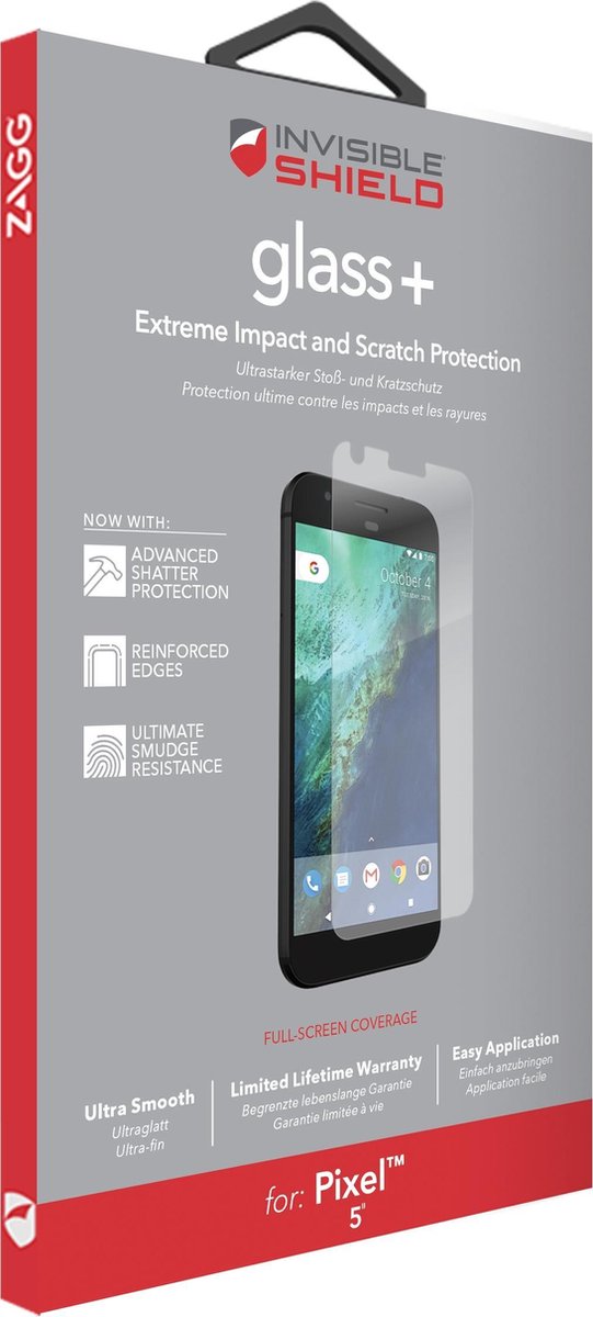 De ZAGG InvisibleShield Glass+ is een van de sterkste screen protectors die je kunt vinden. Waar andere tempered glass screen protectors barsten, vertoont de Glass+ nauwelijks een schram. ZAGG InvisibleShield Glass+ biedt 3X zoveel bescherming tegen barsten dan een gewoon scherm. De Display van uw Google Pixel XL is dus uitstekend beschermd.